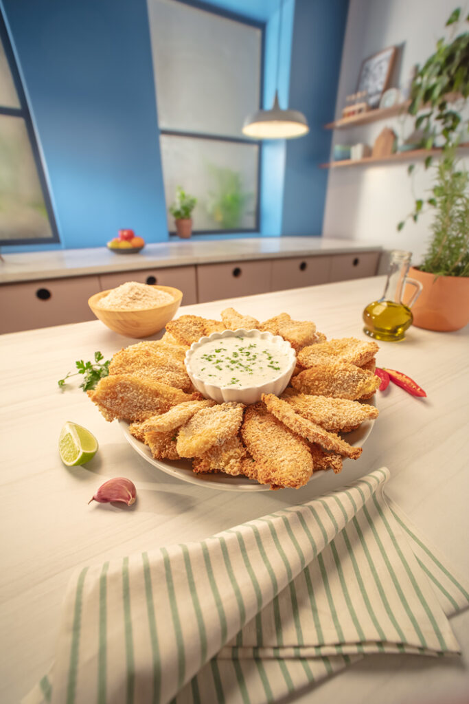 Breaded tilapia appetizer with creamy parsley sauce