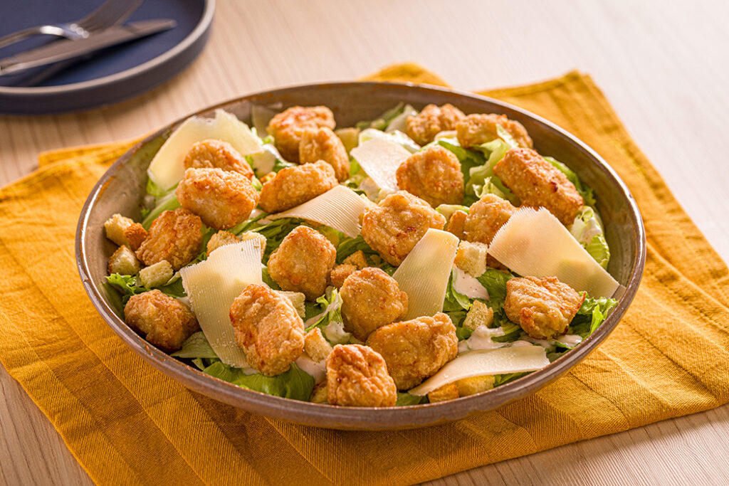 Iscas de filé de peito tempurá com salada Caesar